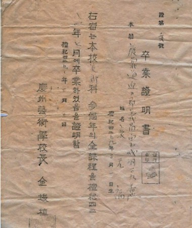 경주예술학교 1회 졸업생 배원복 졸업증명서