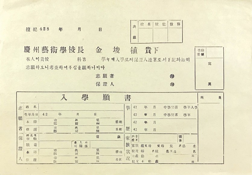 - 경주예술학교는 보증인 연대를 받아서 입학생을 뽑았고, 입학금은 입학금 2,000원 후원회입회금 17,000원, 호국단입단비 1,000원으로 총20,000원이었다.