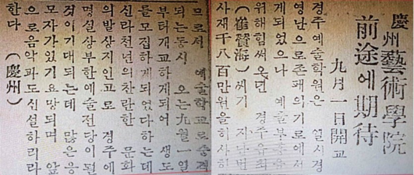 경주예술학교(慶州藝術學校) 구월 일일(九月 一日)부터 개교(開校)