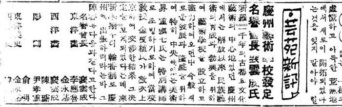 신라 2천년(新羅二千年)의 고도(古都)요 문화예술(文化藝術)의 중심지(中心地)였던 경주(慶州)에서는 해방이래(解放以來) 민족예술(民族藝術)의 육성(育成)과 발흥(勃興)을 위하여 예술학교(藝術學校)를 설립(設立)하고 진력(盡力)하여오던 중(中) 금반(今般) 새로운 발전(發展)과 융성(隆盛)을 위하여 특(特)히 중앙(中央)에 있는 미술계(美術界) 중진7씨(重鎭七氏)는 특별 강사(特別講師)로 초빙하기로하여 당교교수(當校敎授) 김준식씨(金埈植氏)가 수차(數次) 상경(上京)하여 교섭(交涉)한 결과 (結果) 그 결정(決定)을 보게되었다는데 래신학기(來新學期)부터 윤번제(輪番制)로 경주(慶州)에 출장(出張)하리라는바 그 진용(陣容)은 다음과 같다고 한다. 명예회장(名譽會長) 배운성(裴雲城) 동양화(東洋畵) 이응로(李應魯) 김영기(金永基) 서양화(西洋畵) 배운성(裴雲城) 진환(陳환) 조각(彫刻) 윤호중(尹孝重) 유명(兪明) 동양미사(東洋美史) 김영기(金永□) 서양미사