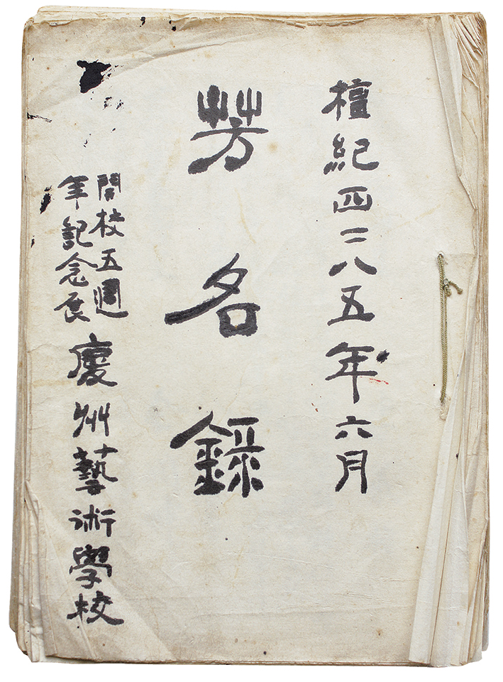 - 경주예술학교 5주년 방명록은 표지를 포함해서 74페이지이다. 경주박물관장 진홍수, 경주예술학교 교장 김준식을 비롯해서, 경주예술학교 졸업생들이 방명록에 이름을 남겼다. 그리고, 지역유지들, 중국집 사장님과 직업으로 보이는 중국인들, 영문 서명을 남긴 외국인 등이 전시를 관람했다. 뿐만 아니라 단체관람을 온 황남초등학교 학생들은 "옛술학교만세"를 외치면서, 경주예술학교의 무궁한 발전을 기원해주고 있다. 말 그대로 온 경주가 5주년 기념전에 참가했다고 할 수 있다. 특히, 이 방명록의 마지막 두페이지는 이 전시에 기금을 기부한 사람들의 명단이 있다. 근대시기 전시의 비용을 내는 형태를 연구할 수 있는 귀중한 자료이다. 1952년 경주예술학교는 교장 김준식, 교수 김영기의 개인전, 학교미술제 등 다양한 전시를 개최했다. 이중 가장 큰 규모로 열린 이 전시의 방명록에는 약 200여 명의 축하인사가 담겨있다.