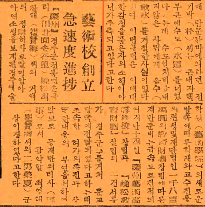 경주군 천북면 손곡리(川北面 손谷理) 만송 최찬해(崔贊海)씨의 거액의 정재(財)히 사로 말미암아 아연소생을 보게된 경주 예술학원(藝術學院)의 새로운 발족에 따른 학재와 교수진용의 편성 및 재단법인 일천팔백만원(一千八百萬圓)의 교육재단(敎育財團) 창립에 따른 제반 준비는 급속도로 진척되여 지난 십사(十四)일 「경주예술고등학교(慶州藝術高等學校)」 창립과 「만송교육재단(晩松 敎育財團)」 설립의 일(一)건 서류가 경주군수를 거쳐 문교 당국에 전달되었다고 하는데 조속한 허가의 촉진과 상새한 내용의 부연을 위하여 앞으로 동 재단의 리사(理事)로서 활약할 최영해(최찬해(崔贊海)씨의 이남(二男) 영하(夏))군상 이경하였다고 한다.