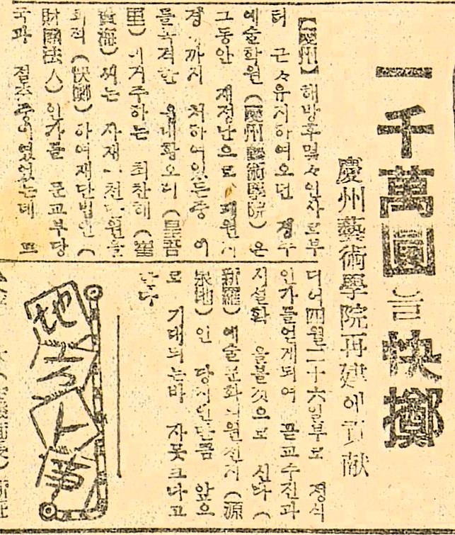 일천만원(一千萬圓)을 쾌척(快擲) 경주예술학원(慶州藝術學院) 재건(再建)에 공헌(貢獻)