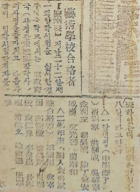 【경주발(慶州發)】 난 22(二十二)일 제1(一)회 입학시험을 실시한 경주예술학교에서는 도교육(道敎育)국(사정관 주재경(朱載慶) 장학사)의 사정을 끝마치고 다음과 같이 입학시험 합격자를 발표(發表)하였는데 개학은 9(九)월 18(十八)일이라고 한다
