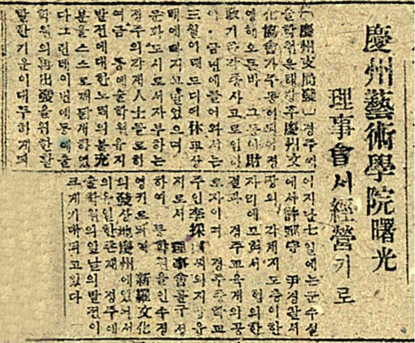[경주지국발(慶州支局發)] 경주예술학원은 해방 후 경주문화협회(慶州文化協會)가 주동이 되어 경영해오든바 그동안 재정(財政) 재정기ㅇ각종사고로 임하야ㅇ 금년에 들어와서는 삼월 이래 드디어 휴교상태에 빠지고 말었으며, 문화도시로서 자부하는 경주의 각계 인사(人士)들로 하여금 동예술학원 유지 발전에 대한 노력의 불충(充)분을 스스로 깨닫게하였다. 그런데 이번에 동예술학원 재출발을 위한 활발한 기운이 대두하게 되어 지난 칠일에는 군수실에서 허군수 윤경찰서장의 각계 지도층이 한자에 모혀서 협의한 결과 경주교육계의 공로자이며 경주중학교 주인 이채우(李採雨)씨외 지역유지 모셔 이사회(理事會)를 구성하여 동학원을 인수경영키로되여 신라문화(新羅文化)의 발(發)상지(地) 경주(慶州)에 있어서의 유일한 존재 경주예술학원의 앞날의 발전이 크게 기대되고 있다.