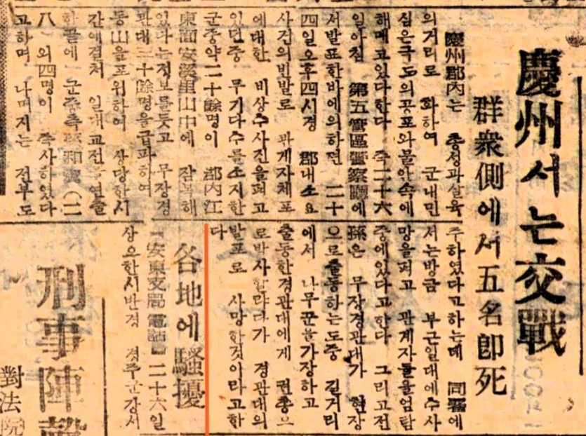 경주(慶州)서는 교전(交戰) 군중측(群衆側)에서 5명(五名) 즉사(卽死)