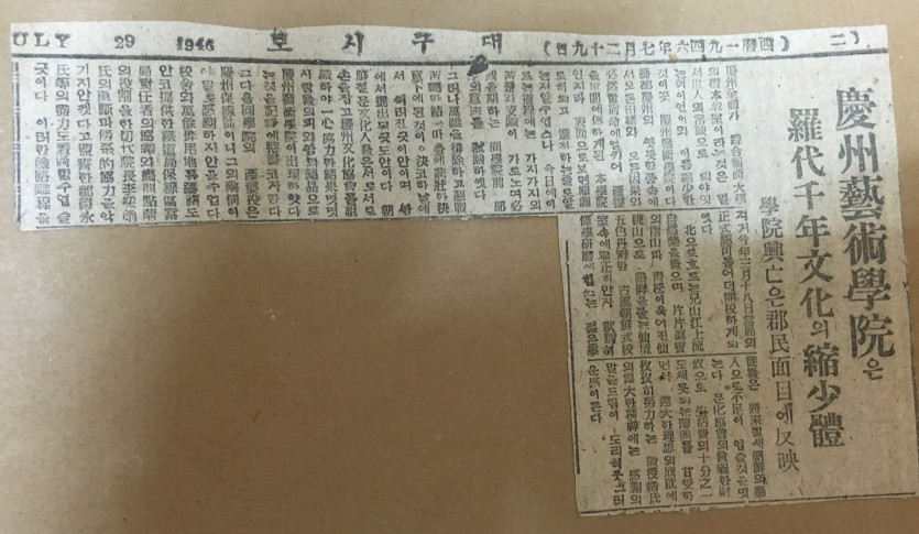 경주(慶州) 전체(全體)가 종합예술학교(綜合藝術大學)의 표본 교실(標本 敎室)이라는 것은 벌써 세인(世人)의 상식(常識)으로 듸야잇는터 이언이와 이를 축소(縮少)한 것이 곳 경주예술학원(慶州藝術學院)이다. 구도(舊都) 경주(慶州)의 따뜻한 품속에서 모든 전제(田제)와 모든 인과(因果)와 필연(必然)할 숙명에 얼키어 산□을 세간(世間)에 전(傳)하게 된 본(本) 학원(學院)인지라 표면(表面)으로 보면 순조(順調)로히되고 주(□) 전하는 줄로 알는지는 알 수 업스나 금일(今日)에 이르는 도정(道程)에는 가지가지의 고초(苦楚)와 지장(支障)이 가로노여 필성(必城)을 기(基)하는 동학원(同學院) 전 部□의 의지(意志)를 시험(試驗)하였다. 그러나 만난(萬難)을 배제(排除)하고 악전고투(惡戰苦鬪)하 결□(結□) 마츰에 비장(悲壯)한 결의(決意) 하(下)에 된 것이 결(決)코 하날에서 떠러진 긋이 안이며, 땅에서 발출(發出)된 긋도 안이다. 조선(朝鮮) 젊은 문화인(文化人)들은 서로서로 손을 잡고 경주문화협회(慶州文化協會)를 조직(組織)하야 일심협력(一心協力)한 결과(結果) 몃몃 사람들의 피와 땀의 결정(結晶)으로 경주예술학원(慶州藝術學院)이 출현(出現)하였다는 것을 기록(記錄)에 보존코자한다. 그 다음 동학원(同學院)의 산파역(産婆役)은 경주보선구(慶州保線구)이니 그의 熱 열정(熱□)이야말로 감동(感動)하지 안을 수 업다. 교사(校舍)와 만여평(萬餘坪) 용지用地)를 □□도 안코 제공(提供)한 철도국보선□(鐵道局保線□) 당국(堂局) 책임자(責任者)의 협조(協調)와 화룡점정(畵龍點睛)의 역할(役割)을 한 초대원장(初代院長) 이채우씨(李採雨氏)의 용단(勇斷)과 방계적(傍系的) 협력(協力)을 악기지 안켔다고 맹세(盟誓)한 정덕영씨(鄭德永氏) 등의 진력(盡力)도 간과(看過)할 수 업슬 것이다. 이러한 험로난정(險路難程)을 격거 금년(今年) 3월(三月) 18일(十八日) 당국(堂局)의 정식인가(正式認可)를 어더 개교(開校)하게 되었다. 북(北)으로 흐르는 형상강(兄山江) 상류(上流) 자연악(自然樂)을 들으며 편편진보(片片眞寶)의 남산(南山)과 청송(靑松)이 욱어진 선도산(仙桃山)으로 화병(畫屛)을 둘는 선경(仙境) 오색단청(五色丹靑)한 고풍(古風) 조선식(朝鮮式) 교실(敎室) 속에 단정(端正)히 안자 □□히 수학(修學) 연마(硏磨)에 힘쓰는 젊은 학도(學徒)들은 장래(將來)할 새조선(朝鮮) 예인(□人)으로 부족(不足)이 업슬 것을 밋는다. 문화협회(문化協會)의 빈약(貧弱)한 재정(財政)으로 생활비(生活費)의 십분지일(十分之一) 도채 못되는 박우(薄遇)를 감수(甘受)하면서 원대(遠大)한 이상 (理想)의 성취(成就)에 자자(孜孜)히 노력(努力)하는 교수제씨(敎授諸氏)의 위대(偉大)한 정신(精神)에는 감사(感謝)의 말을 드림이 도리혀듯 그러운 감(感)이든다.