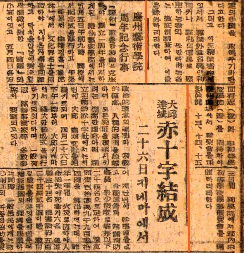 중□(重□)한 파□(波□)을 극복(克服)하야 창립(創立) 일주년(一 周年)을 마지하게된 경주예술학원(慶州藝術學院)에서는 오월(五 月) 오일(五日) 오전 아홉시(午前 九時) 동교(同校)에서 기념식(記念式)을 거행(擧行)하고 오후 한시(午後 一時)부터 기념식(記念式)을 유서(由緖) 깁흔 「논호림(論虎林)」에서 문화계(文化界) 명사(名士)를 초대(招待)하야 지난 온 자취를 회고(回顧)하고 닥쳐올 압날에 대비(對備)할 새 개발(開發)에 대(對)한 「논의(論議)」와 소연(小宴)이 잇고 오월(五月) 사일(四日) 각(各) 방면(方面) 유지(有志)(야(夜))와 중초등학교 학도(中初等學校學徒)(주(晝))를 초대(招待)하야 경주극장(慶州劇場)에서 음악회(音樂會)를 무료공개(無料公開) 십삼(十三), 십사(十四), 십오(十五) 삼일(三日) 간(間) 동학원(同學院)에서 군내(郡內) 중초등학교(中初等學校) 학도전람회(學徒展覽會)를 개최하리라 한다.