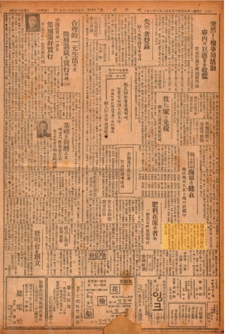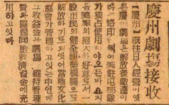 【경주(慶州)】 기왕(旣往) 일인경영(日人經營)이엿든 경주극장(慶□劇場)은 해방후(解放後) 적산(敵産)이라 낙인(烙印)찍어 미주둔부대(美駐屯部隊)가 독점사용(獨占使用) 하야오든바 요지음 미군(美軍)의 초대(大)하 호의(好意)로서 일반시민 (一般市民)의 건전오락기관(健全娛樂機關)으로 해방(解放)하기로 되였어 당지(當地) 문화협회(文化協會)가관리(管理)하고 잇는 중(中인)데 그 수익금(收益金)을 극장(劇場) 유지관리비(維持管理費)와 귀환동포(歸還同胞) 구제자금(救濟資金)에 충용(充用)하고잇다.