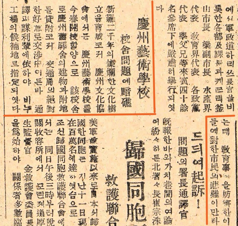 신라 이천년(新羅 二千年)의 찬란(燦爛)한 문화수립(文化樹立)을 육성(育成)코저 경주문화협회(慶州文化協會)에서는 경주예술학교(慶州藝術學校)를 금춘(今春) 개교(開校)할양으로 해교사(該校舍)로 경주(慶州) 구역사(舊驛舍)의 건물(建物)과 부지(附紙)를 대부(貸附)코저 교통부(交通部)의 절대(絶對)한 호의(好意)로 교섭중(交涉中)이든바 통역(通譯)과 모리배(謀利輩)에 의(依)하야 비누공장(工場)의 후보지(候補地)로 지정(指定)되엿다는데 교육사□(敎育事□)을 방해(妨害)한 이들에 대(對)한 시민(市民)의 비난(非難)이 만타.