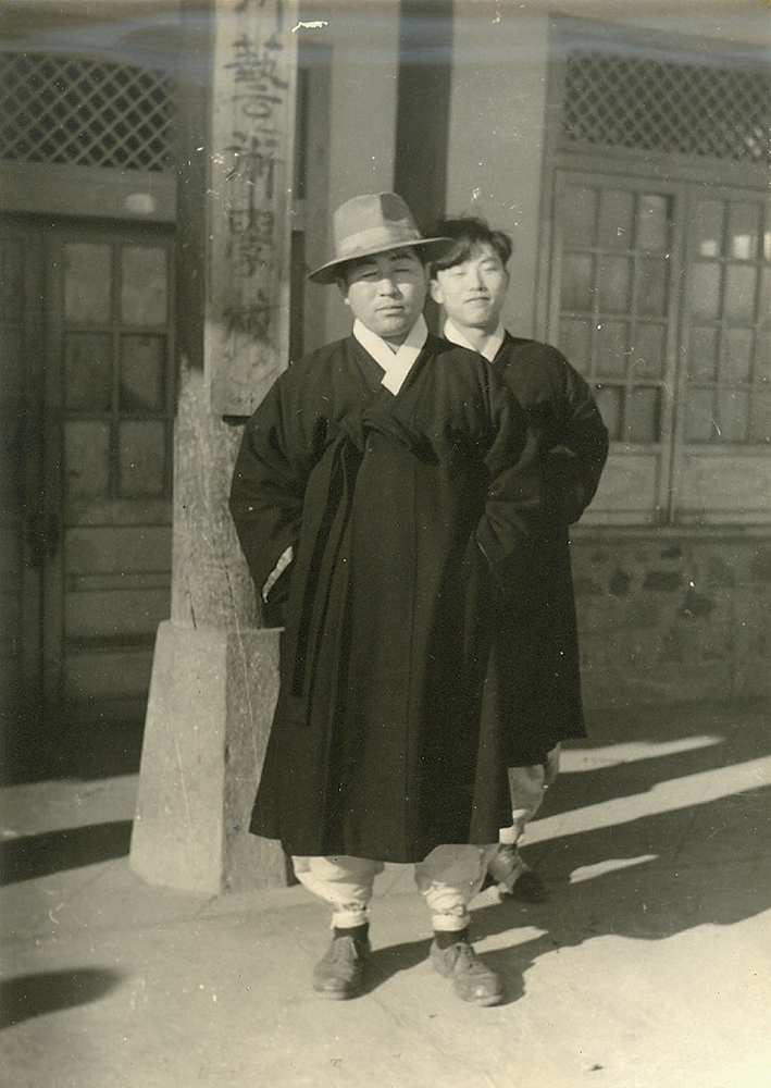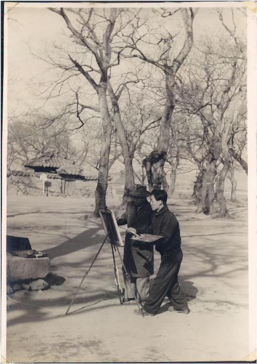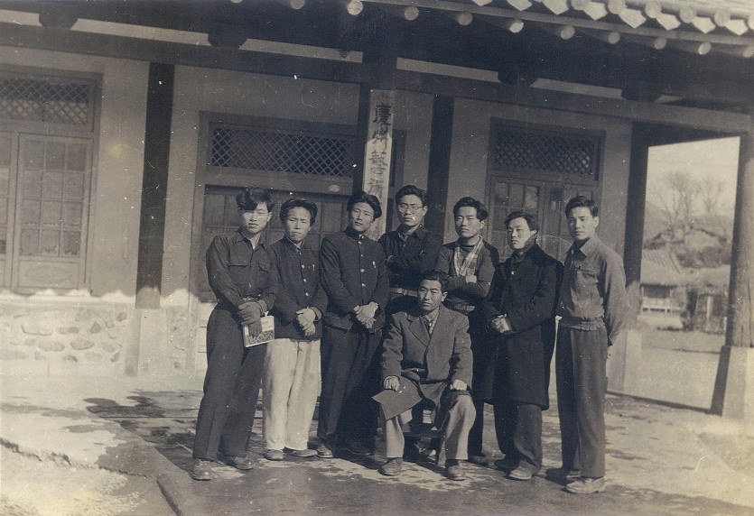 예술학교 현판 앞에서 제자와 한복을 입고 찍은 사진도 있다. 김준식은 한국전쟁 시기에도 예술학교를 발전시키고 유지하는데 모든 열정을 쏟아 부었다.